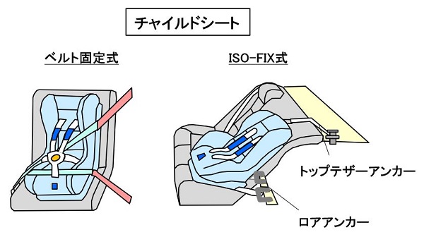 ベルト固定式がシートベルトで固定するのに比べ、ISOFIX方式はチャイルドシートの固定用アンカー(ロアアンカー)と、上部を固定するデザートップアンカーで固定します。