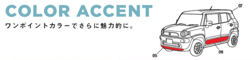 クロスビーのカラーコーディネートを彩るアクセサリーとして、大きく「デカールコーディネート」「カラーアクセント」「ホイールアクセント」の3つが用意されています。
