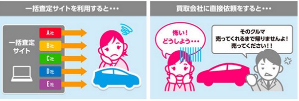 一括査定では、あなたが登録した情報(個人情報、車両情報)は査定を行う買取業者に渡されますので10社に査定を依頼すれば10社にあなたの情報が渡されることになります。また、多くはないと思うのですが実車査定時には「車を売ってくれるまで帰らない」とゴネる業者も存在するとのことです。