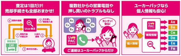 「安心」については、「ユーカーパック」はオークションの主催者という立場で査定を行うため、オークション参加企業(約5000社)に個人情報が渡りません。渡されるのは車両に関する査定情報だけです。
